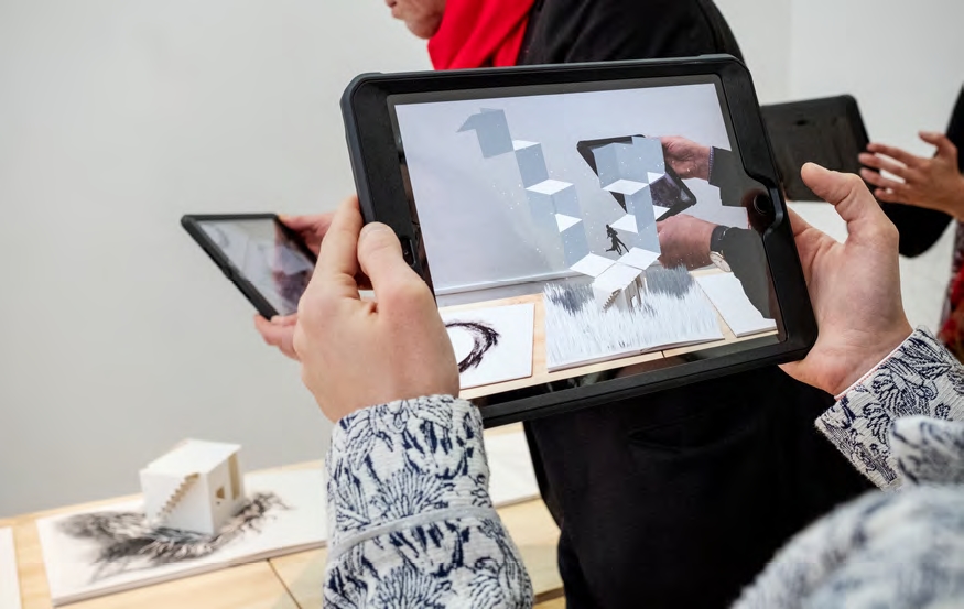 En les regardant à travers une tablette numérique, les dix doubles pages du livre pop-up Acqua Alta - La traversée du miroir deviennent de petits théâtres en réalité augmentée, où se déploie une forme dansée grâce à l’application développée sur-mesure. Papiers blancs pliés et dessins à l’encre rencontrent, dans une épure graphique et la simplicité du noir & blanc, la vie artificielle d’êtres miniatures dansant dans un monde empreint de l’imaginaire de l’eau.